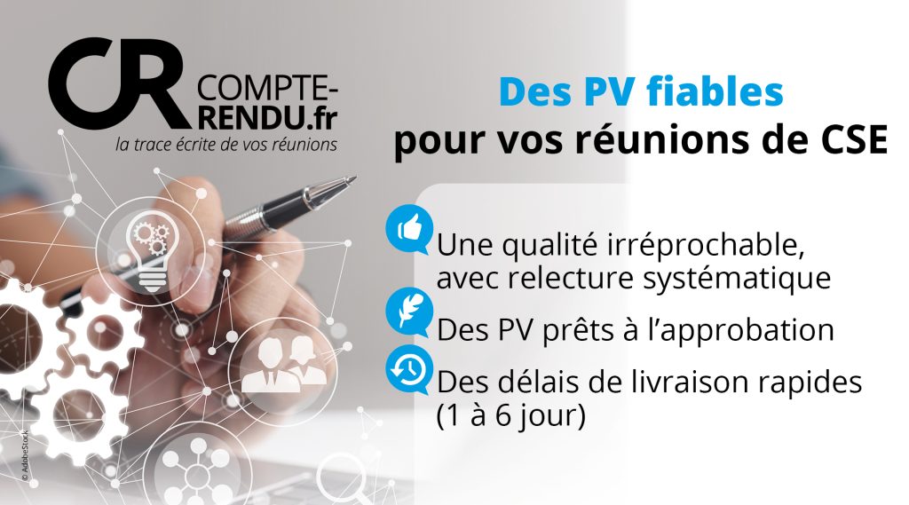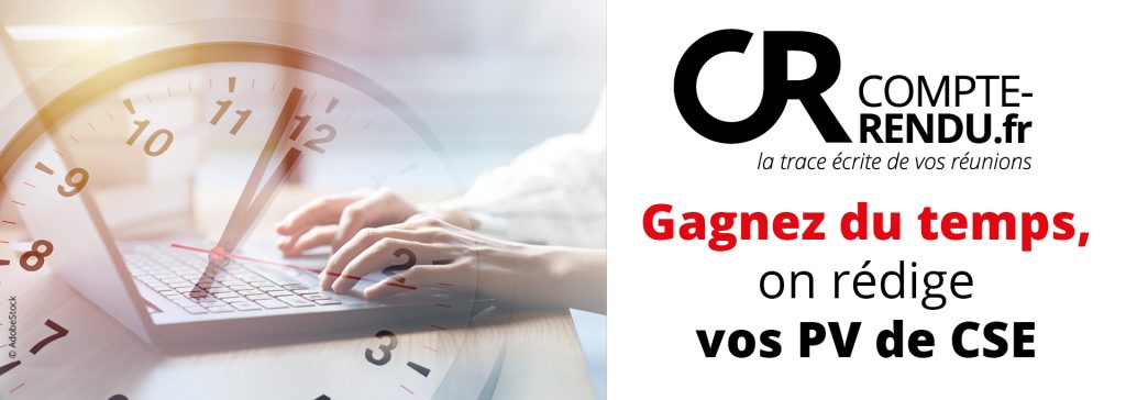 Se libérer de la tâche chronophage qu’est la rédaction des PV de CSE : avec Compte-rendu.fr, c’est possible ! En effet, si vous êtes Secrétaire de CSE, le Code du travail vous permet de recourir à l’enregistrement ou à la sténographie des séances du CSE (article D2315-27). Profitez-en donc pour faire appel à un prestataire fiable, qui vous assurera une rédaction de PV de qualité !