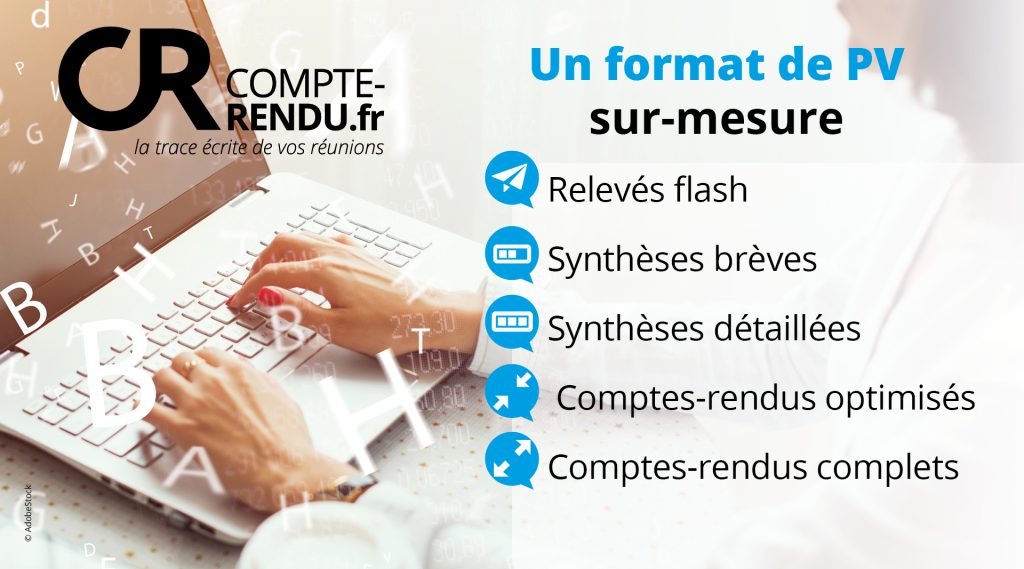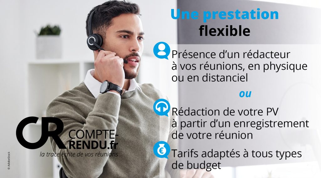 L’offre de prestation inclut la possibilité d’inviter un rédacteur à vos réunions en présentiel ou en visio, ou encore de faire rédiger vos PV sur enregistrement. Compte-rendu.fr propose également de nombreux types de procès-verbaux, avec des niveaux de détail plus ou moins élevés. Ainsi, vous serez libres de choisir la prestation et le format de PV qui vous conviennent, le tout à des tarifs toujours très avantageux. En effet, la société maintient des prix bas en permanence et ne fixe aucun minimum de facturation.