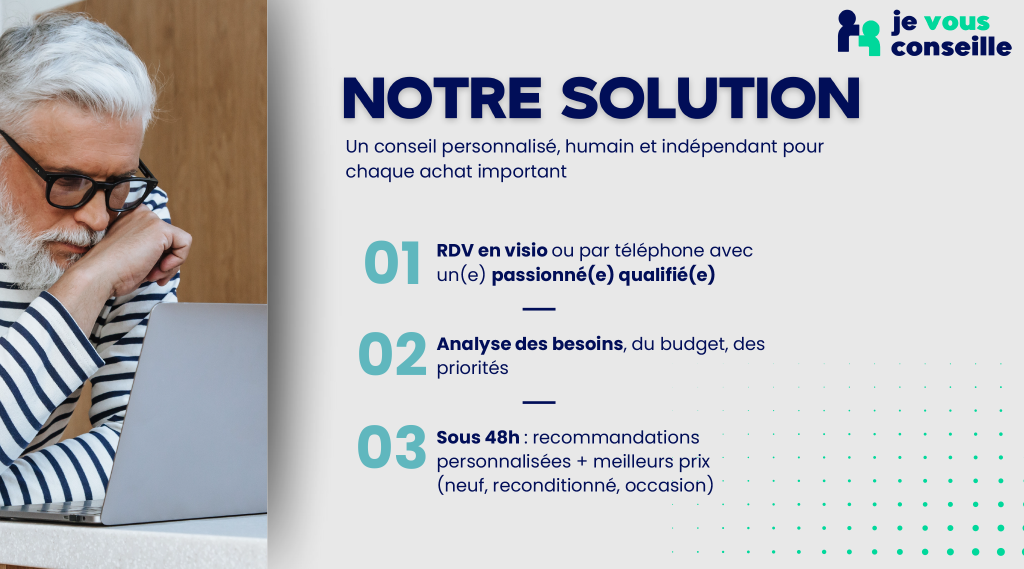 Il expose ses besoins, son budget et ses contraintes. Sous 48h, il reçoit une recommandation personnalisée du bon produit, accompagnée des meilleurs prix du marché (neuf ou reconditionné), identifiés par nos robots qui scrutent l’ensemble des sites e-commerce. Le tout sans aucune pression commerciale ni intérêt de vente, pour garantir un conseil totalement neutre et objectif.