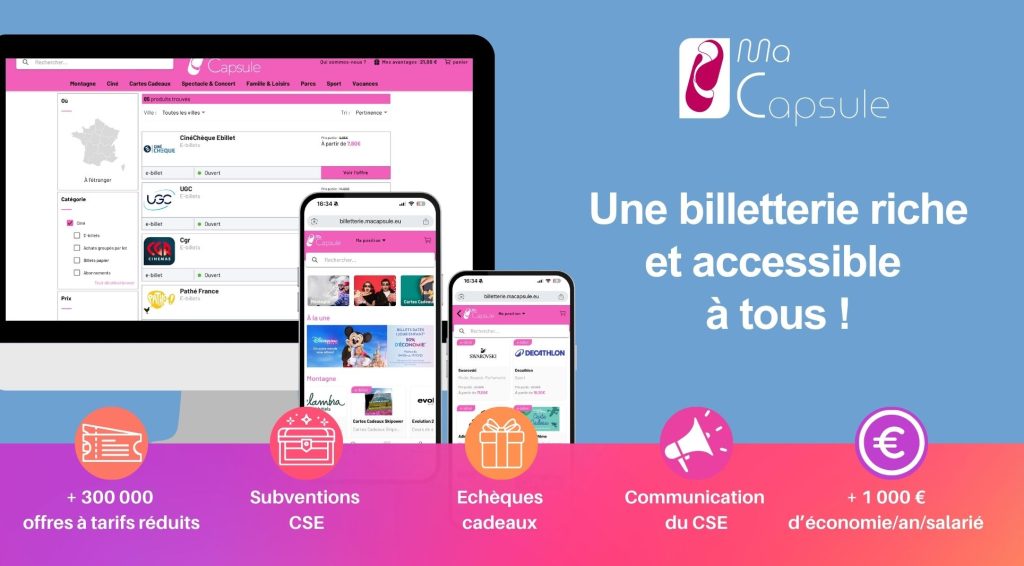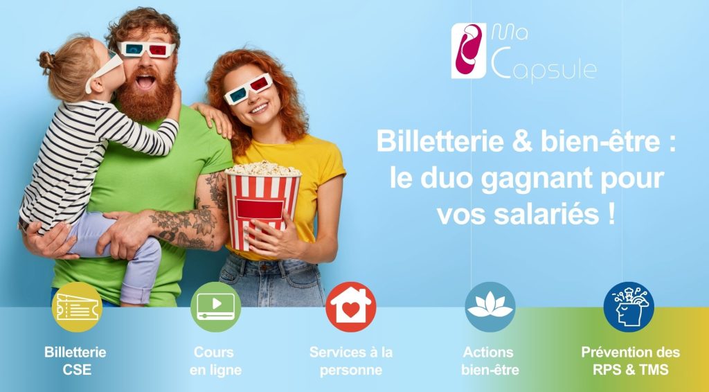 Contrairement aux billetteries traditionnelles, Ma Capsule est la seule plateforme CSE qui combine billetterie et bien-être au travail. Vos collaborateurs profitent des loisirs à prix réduits et peuvent aussi s’inscrire à des ateliers de prévention santé, de sport ou de relaxation. Un double avantage qui répond aux attentes : 72 % des salariés souhaitent que leur CSE propose également des actions bien-être.