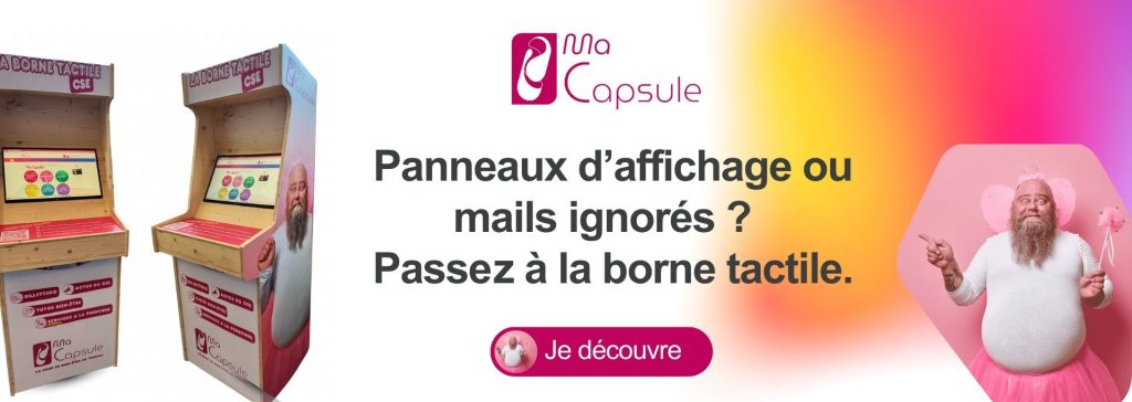 Un CSE peut déployer des dizaines d’actions, mais si les salariés ne les voient pas… autant les garder dans un classeur. Soyons francs : les mails du CSE sont rarement lus et le tableau d’affichage papier, c’est un peu l’équivalent du fax en 2025. Résultat : vos animations, vos voyages ou vos PV passent inaperçus. Avec la borne tactile Ma Capsule, vos infos s’affichent enfin là où vos collaborateurs passent vraiment : machine à café, espace détente, atelier, etc.