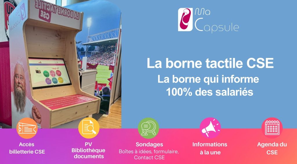 - CSE des laboratoires Aguettant : deux sites, salariés sans poste informatique. Ils ont installé deux bornes Ma Capsule pour donner accès à la billetterie et aux infos CSE. Résultat : une communication claire, accessible et moderne, même en atelier.