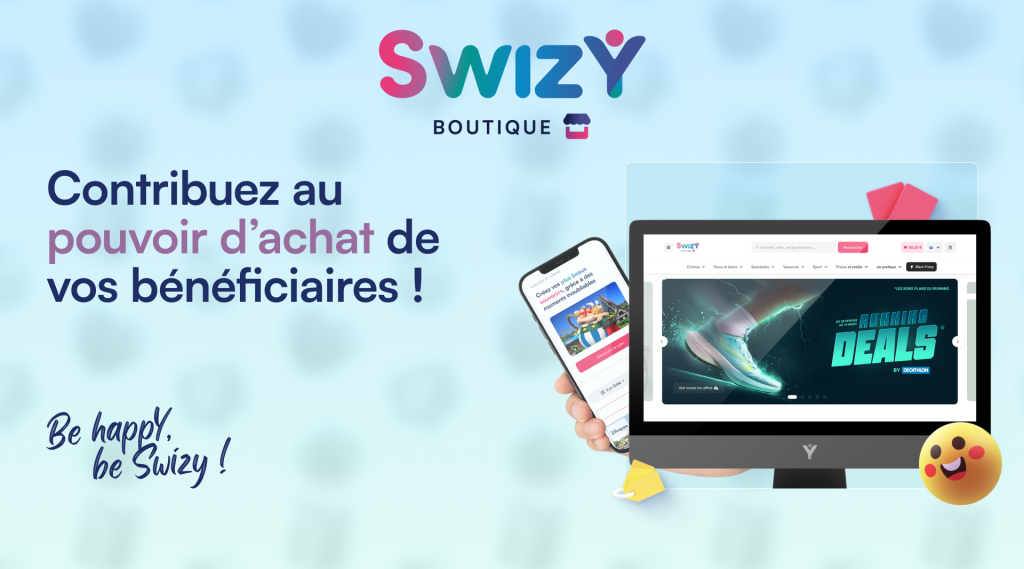 Swizy c’est aussi des bons d’achat dans tous les univers de consommation est un gain de pouvoir d’achat non négligeable : Culture et loisirs, sport et bien-être, vacances, vie quotidienne, … les bénéficiaires seront ravis.