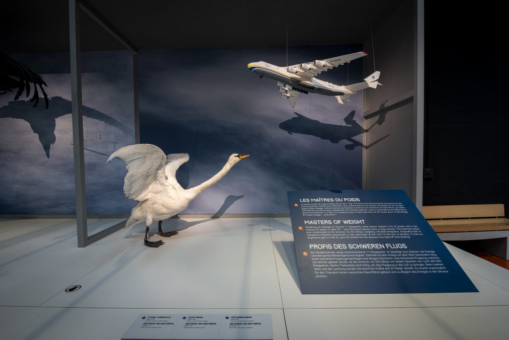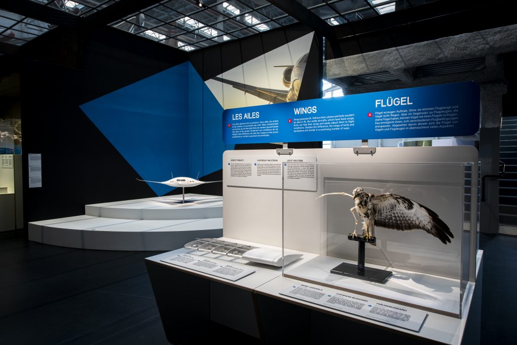 Collections d’animaux naturalisés, maquettes d’aéronefs, fossiles et reproduction d’un dinosaure à plumes, documents d’archives, ainsi que de nombreux dispositifs interactifs, films d’animation et jeux multimédias… sont réunis pour que petits et grands retracent l’évolution du vol grâce aux maîtres des airs – comme le faucon pèlerin, le colibri ou le condor des Andes – sans oublier leurs équivalents mécaniques (Rafale, Concorde…), les prouesses des pilotes et les inventions exceptionnelles des pionniers de l’aviation, souvent inspirées du monde animal.