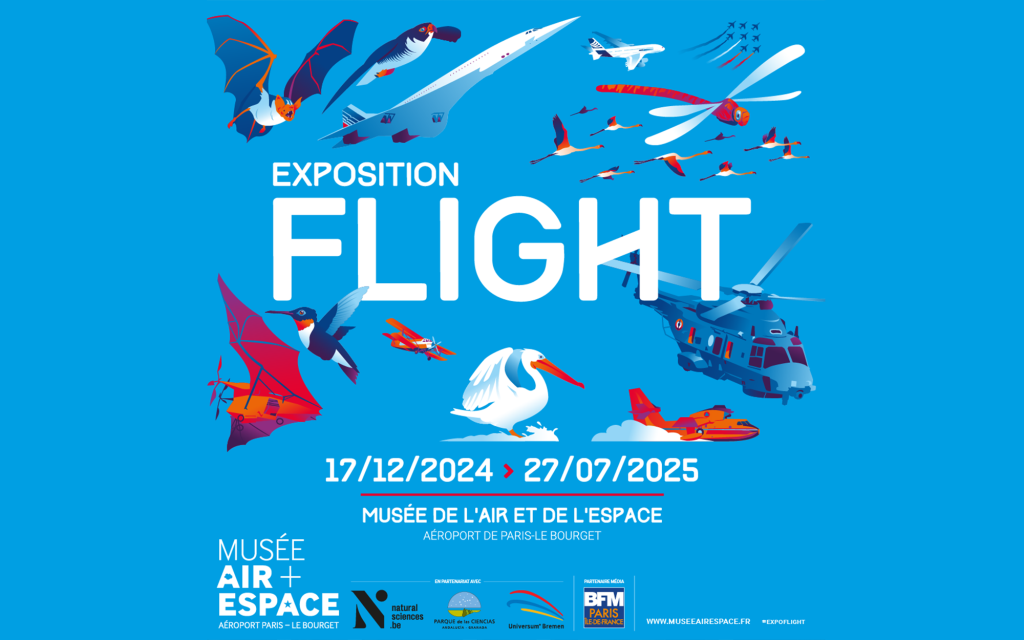 Conçue en partenariat avec l’Institut royal des Sciences naturelles de Bruxelles en Belgique, l’Universum® de Brême en Allemagne et le Parque de las Ciencias de Grenade en Espagne, Flight marque la première halte de son itinérance au Bourget. En plus du propos commun, les visiteurs pourront découvrir une sélection de pièces issues des collections patrimoniales du musée de l’Air et de l’Espace, présentées dans la section « Le rêve de voler ». Cette séquence historique permet entre autres d’exposer la pâle originale de l’hélicoptère d’Etienne Oehmichen, dont le projet de restauration a été initié par les équipes du musée. L’extrême rareté d’une voilure des années 1920 conservant son entoilage d’origine a conduit à privilégier une approche sans remplacement de pièces. Le nettoyage et la consolidation de la pale ont permis la conservation des matériaux d’époque.