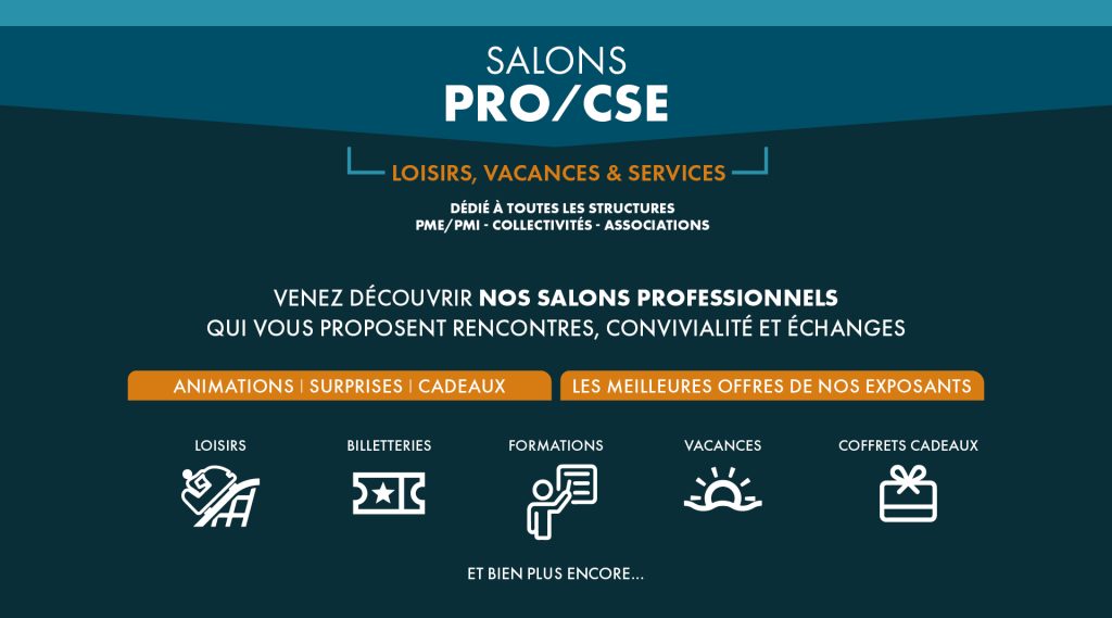 Dans une ambiance conviviale, profitez également de nos salons professionnels. Une occasion inédite d’échanger avec un panel de partenaires sélectionnés pour vous. Ils représenteront différents secteurs comme la culture, les loisirs, les vacances et tous les services dédiés à la qualité de vie de vos salariés ou adhérents.