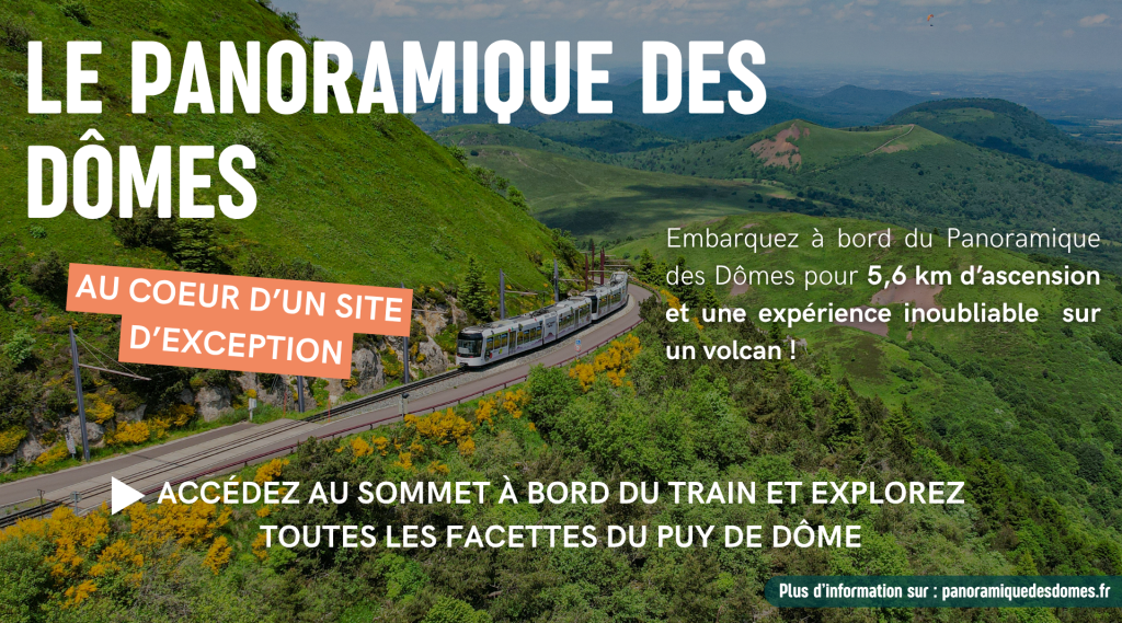 Depuis son inauguration en 2012, le Panoramique des Dômes a embarqué des millions de visiteurs dans un voyage de 15 minutes à travers les paysages volcaniques d’Auvergne. Sans bruit ni pollution, ce train à propulsion électrique grimpe en douceur sur les flancs du volcan, offrant une vue spectaculaire sur la plaine de la Limagne, les monts du Forez et les autres volcans endormis. Arrivés au sommet (1 465 m d’altitude), les visiteurs découvrent un panorama à 360° et un site naturel grandiose.