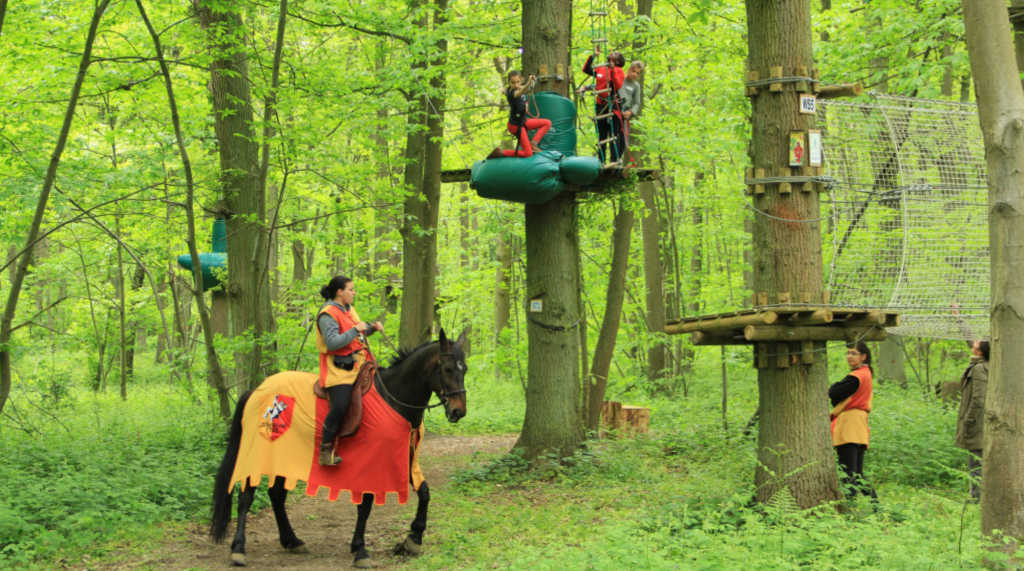 Ce qui distingue Sherwood Parc des autres sites d’aventure, c’est son univers thématique omniprésent. Dès l’entrée, le visiteur est accueilli dans un cadre inspiré de la légende de Robin des Bois. Les équipes du parc, en costume de chevaliers, assurent l’encadrement, et la surveillance des parcours se fait en partie à cheval, renforçant cette ambiance médiévale. Même les chevaux du parc sont caparaçonnés comme lors des tournois d’antan, une attention aux détails qui participe à l’expérience immersive.